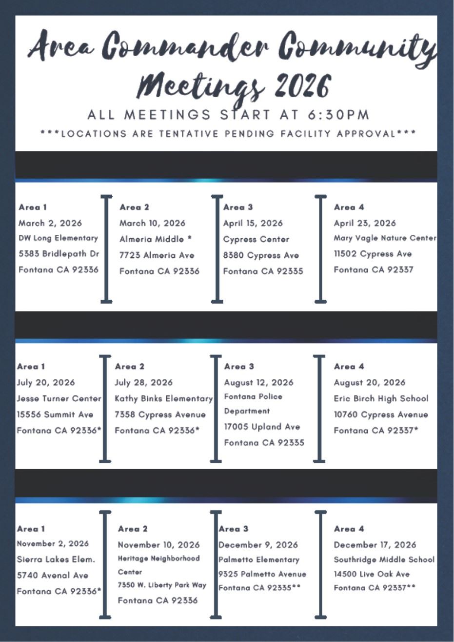 As part of the ongoing commitment and dedication to the Fontana community, and in an effort to prove a more effective and intensive police response to specific community needs, the Mayor, City Council, and Police Department have implemented the Area Commander Program.